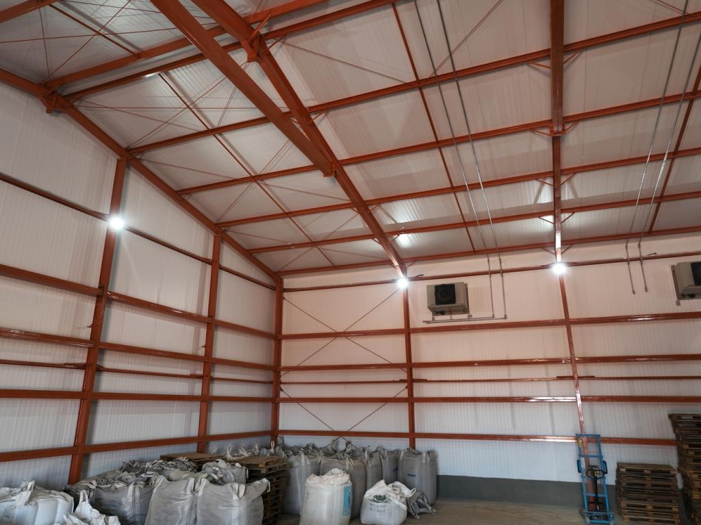 A obra em Matrinchã – GO integra um armazém de alta capacidade com uma câmara fria moderna, projetados para garantir eficiência, segurança e controle ideal das condições de armazenamento. Essa combinação permite atender tanto à conservação de sementes e grãos quanto a produtos que exigem ambientes climatizados e estáveis.